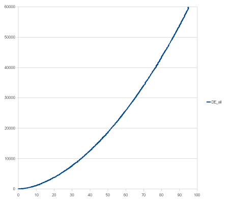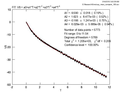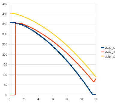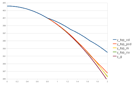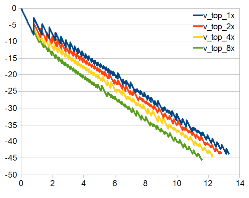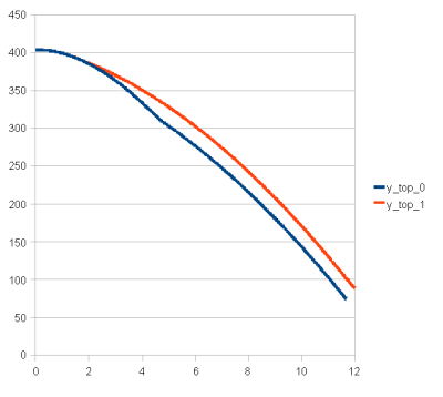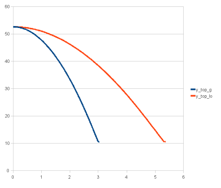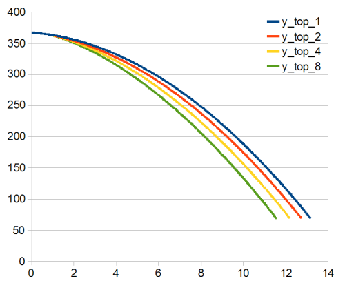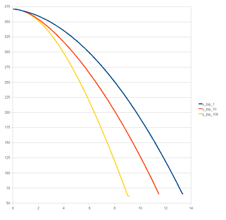 If you compare to the graphs posted in the referenced War Wheel thread, the immediate obvious difference is that this scheme does not result in the final velocities ending up the same in each case, the heavier ones are faster - all falling the same distance. Otherwise, there's not much discernable difference amongst any of the different schemes, shape-wise.