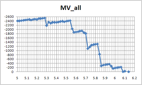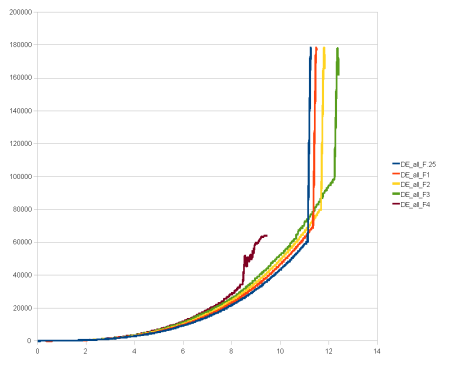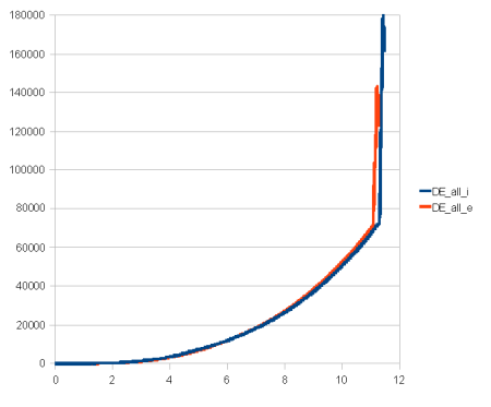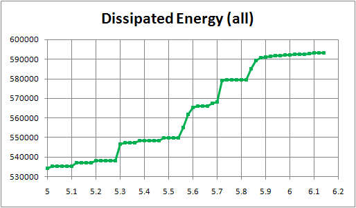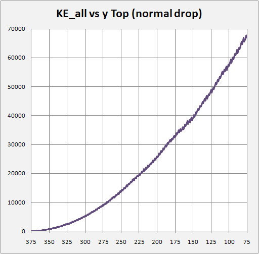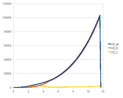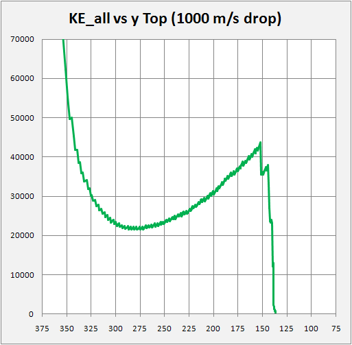 The previous graph compares KE in the time domain, but that's not an entirely fair comparison since the high speed collapse crushes much more structure per unit time. These two graphs compare the KE of the high speed and normal collapse against position. Still, not too revealing but this time we see the KE is actually comparable by the collapse position.