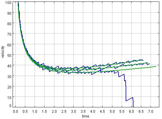 Comparing against an analytical result which arrests in the same time, the stepwise model had to have support capacities increased 3.7x. This has been added to the previous graph of stepwise results showing velocity versus displacement (the orange line):