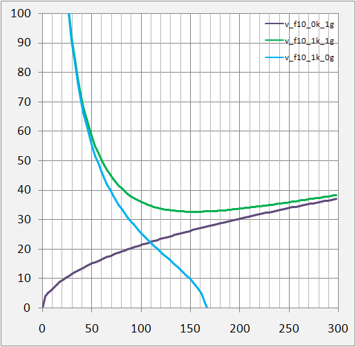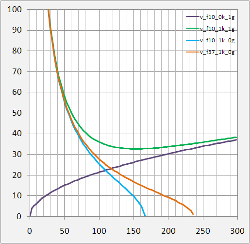 The previous three cases will be examined in greater detail shortly. In the meantime, here is a similar pair of graphs for the same configurations done in the stepwise calculator. The big difference is that these are in the spatial domain; that is, plots of velocity versus position instead of versus time, because the step increment is spatial in the stepwise calculation. Kind of an interesting twist. The two zero g cases of FOS 5 and 10 arrest as in the physics sim, but none of the 1g runs arrest.