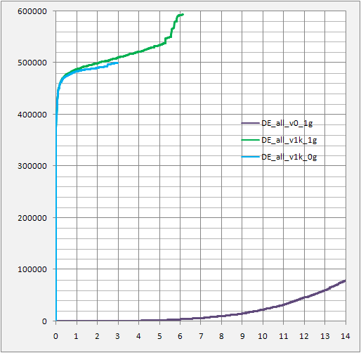 What is the point of investigating the results of 1000 m/s drop speeds? Curiosity and calibration. Based on more everyday (? by that I mean one day out of all of history versus never) conditions of the speed of a single story drop, I'd ascertained the values of a couple of parameters that are key in step-wise calculations, the average equivalent resistive force over a story and the effective compaction ratio. By showing these values to be consistent even into extreme conditions, the stability of the simulator is confirmed. Having reliable values allows direct comparison of trials using both methods with the same input, as was done for the graphs above.