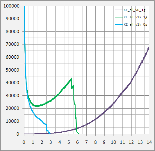 The green lines, with gravitational attraction added as a driving force, are dramatically different in nature from the zero g (red and blue) in which initial kinetic energy of the impactor is the only energy input to the system. At only 0.5 seconds in, the velocity has decreased tremendously in all cases, but by 1 second the greens are already splitting off noticeably. By 2.5 - 3.0 seconds, the green lines have hit a minimum of velocity and are beginning to accelerate again!