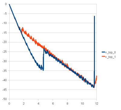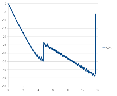 The first segment is essentially freefall, an unavoidable consequence of a simple slab model, the second segment is a shallower jaggy line composed of freefall descent peppered with jolts. Without high-resolution data, the line would appear straight with gaussian noise rather than unambiguously showing the customary sawtooth pattern of freefall punctated with jolts, as seen in this close up of the speed between seconds 4 and 6: