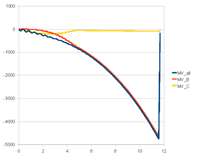 Less interesting, but still useful, is a graph showing the momentum possessed by Zones B and C as well as the total momentum (which includes 'stationary' Zone A, which can and does oscillate):
