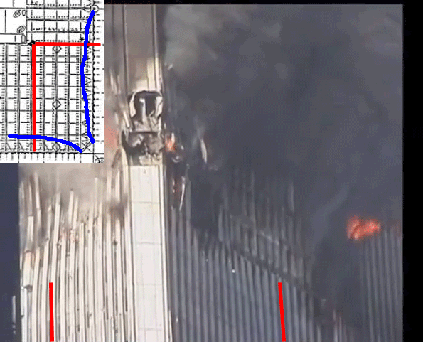 The west face MER panel is shown in the graphic as a red rectangle. The 75th floor beam flooring between the perimeter and the core is shown in yellow. Those portions seem to have remained together still attached when they were ejected from the west face of the building.