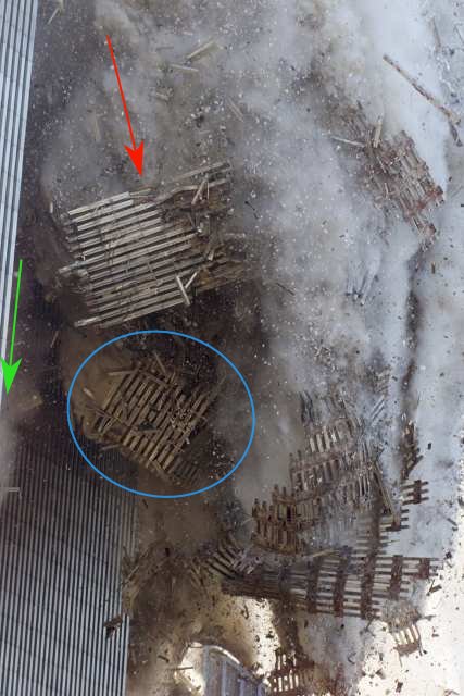 The extra-strong MER panel sections are distinctly leading the falling debris in images taken from the west during collapse. The red trajectory and the blue sheet of panels are marked.