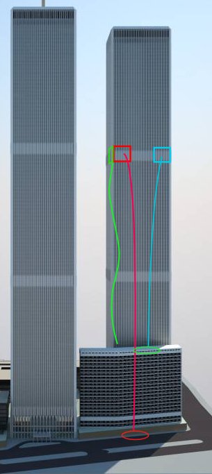 The perimeter MER panels colored in the graphic below fell along the marked trajectories. There was beam flooring from the 75th floor Mechanical equipment rooom (MER) still attached to the west face MER sheets of panels.