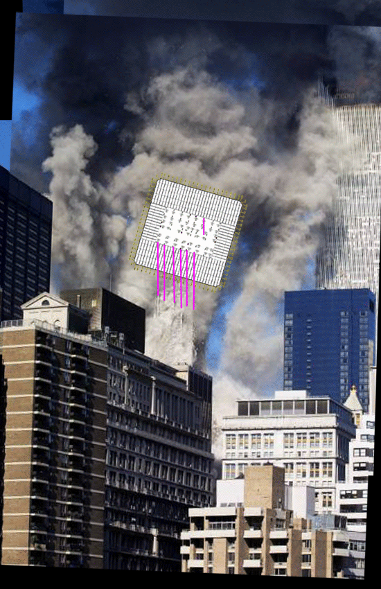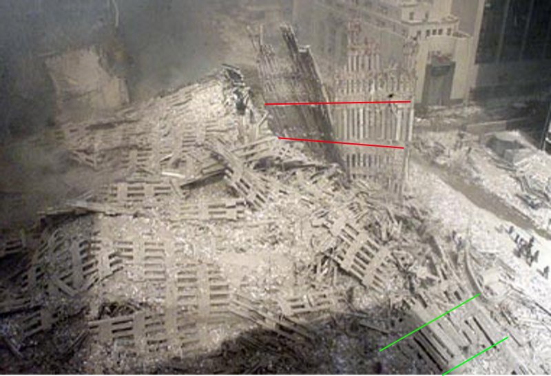 The collapse fronts move down the east face earlier than they move down the west face. This means the panels to the east will be stripped of support earlier than the panels to the west. This can create a twisting motion of large sheets of perimeter panels as they fall away from the building to earth, landing at an angle to the footprint like this: