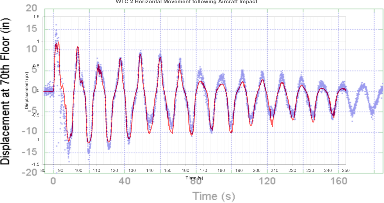 That the NIST moire method can only be used for one single point and my method can be used anywhere on the frame leads me to suggest that I'm generating the best quality positional data for the other building locations that there has been presented thus far. It is not clear at all how NIST performed their roofline positional data, but it's description suggests it was not great quality (their described initial point cannot be determined accurately, and there's no way to determine where the roofline actually is near their described location). There's then the fact that they used a point somewhere around the mid-point of the building width in the Cam#3 footage, which has the implication that they've interpreted the flexing and twisting motion as vertical movement, and ignored perspective correction. All these issues can be cleared up by using better, and public, trace data.