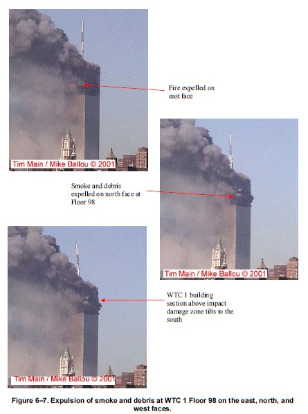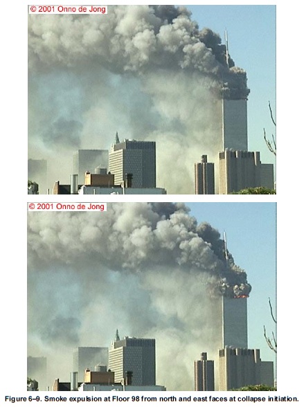 The NIST claims the first signs of collapse initiation were from ejections along the 98th floor. The first visible ejections were actually from the ~87th floor and they were followed by a second set of ejections along the 95th floor.
