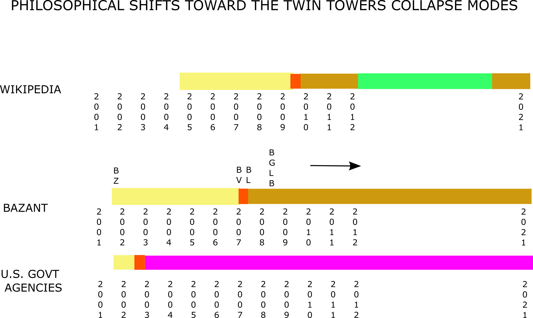 The collapses happened in 2001. The red region is when a philosophical change took place in each case. In the areas before the red region the Twin Towers collapse modes were described in only the most general and generic terms by each party.