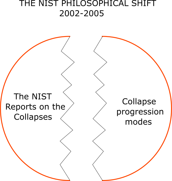 These changes in philosophies are all related to each other. The NIST philosophical shift came first when for some private reason they decided to discard anything having to do with the Twin Towers collapse modes and not make a single comment on the collapse modes that is more than 3 words. That has been going on since 2002 and is still going on today.